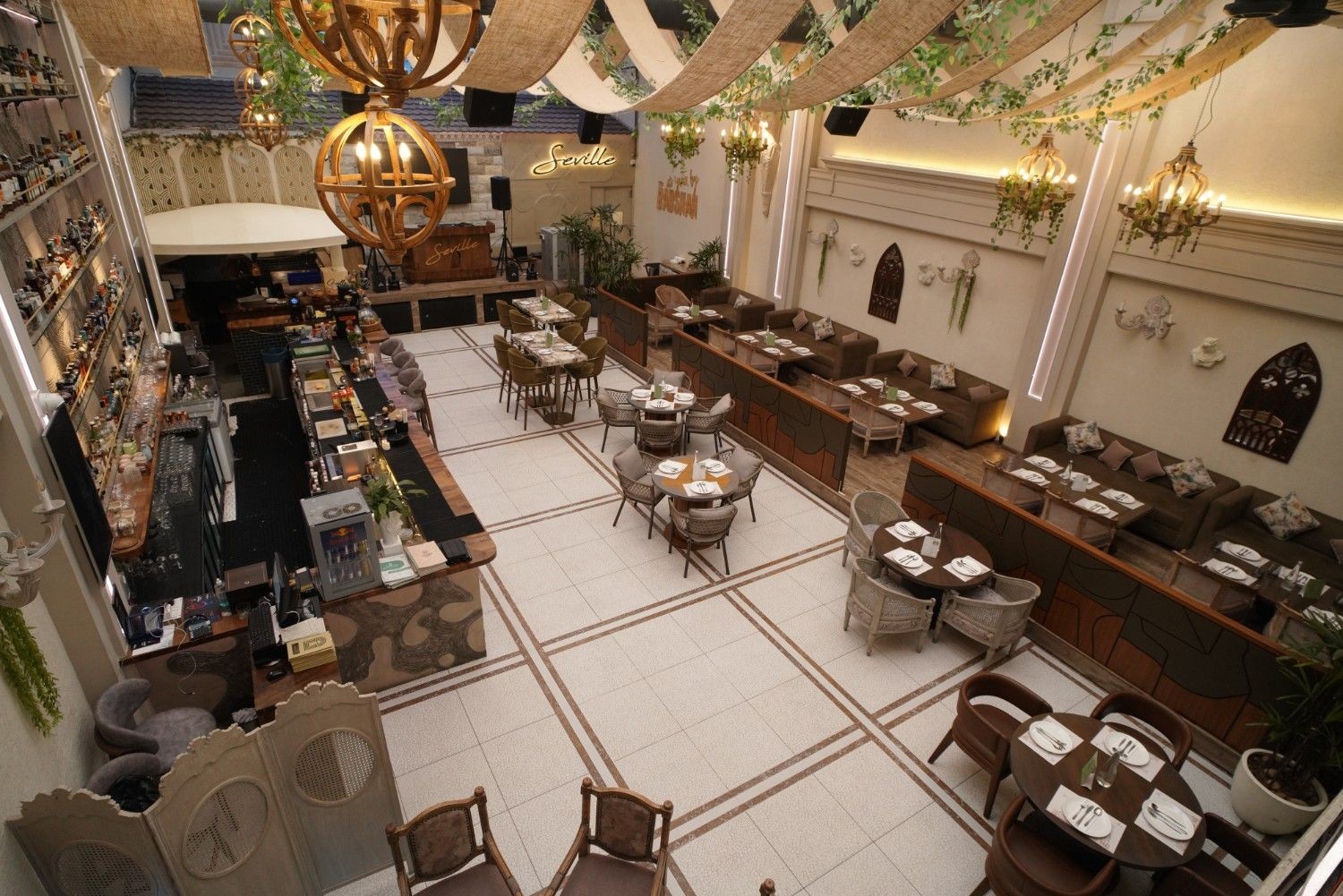Seville takes its name from the Andalusian capital, a city built around courtyard culture, afternoon shade, and the unhurried rituals of a good meal. That same architecture of ease informs everything here. The open-to-sky ceiling. The mosaic floors. The rustic wooden chandeliers. A handcrafted stone bar counter that took weeks to build and intends to be here for decades.